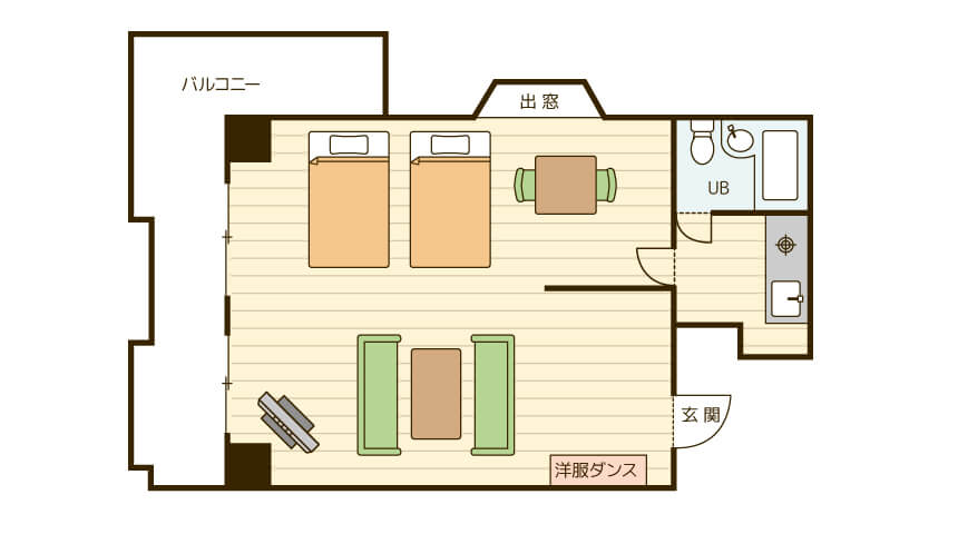 | 部屋タイプ | シングル (1名タイプ 18.08㎡) ダブル (2名タイプ 24.00㎡) ツイン (2名タイプ 24.00㎡) Dxツイン(2名タイプ 44.06㎡) |